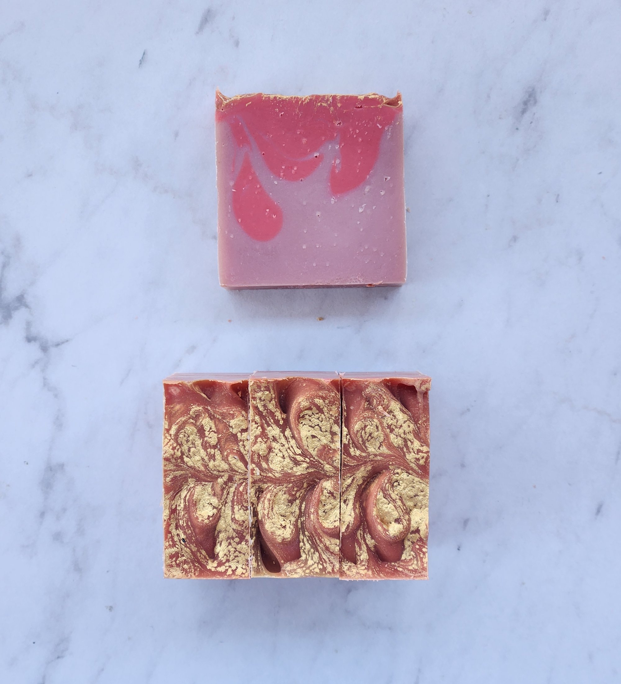 Ingredients: Rice Bran Oil, Water, Coconut oil, Sweet Almond Oil, Shea Butter, Sodium Hydroxide, Castor Oil,Sodium Lactate, Fragrance and Mica.